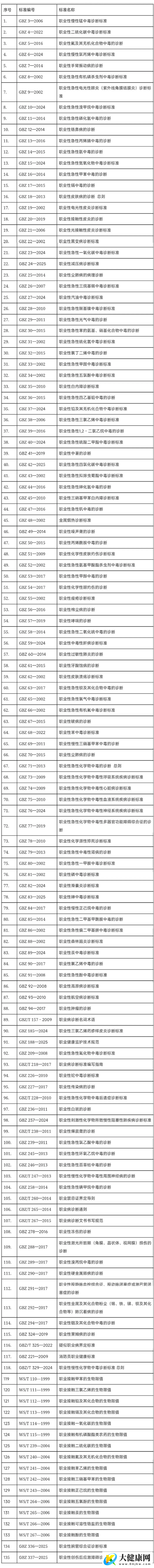 人民网北京12月4日电 (记者乔业琼)据中疾控微信公众号消息,职业病诊断标准是保护广大劳动者身心健康的有力技术支撑。为更好地帮助广大从事职业病诊断相关工作的专业技术人员掌握和使用职业病诊断标准,职业健康标准专业委员会秘书处整理了截至2025年11月30日的135项职业病诊断标准目录。